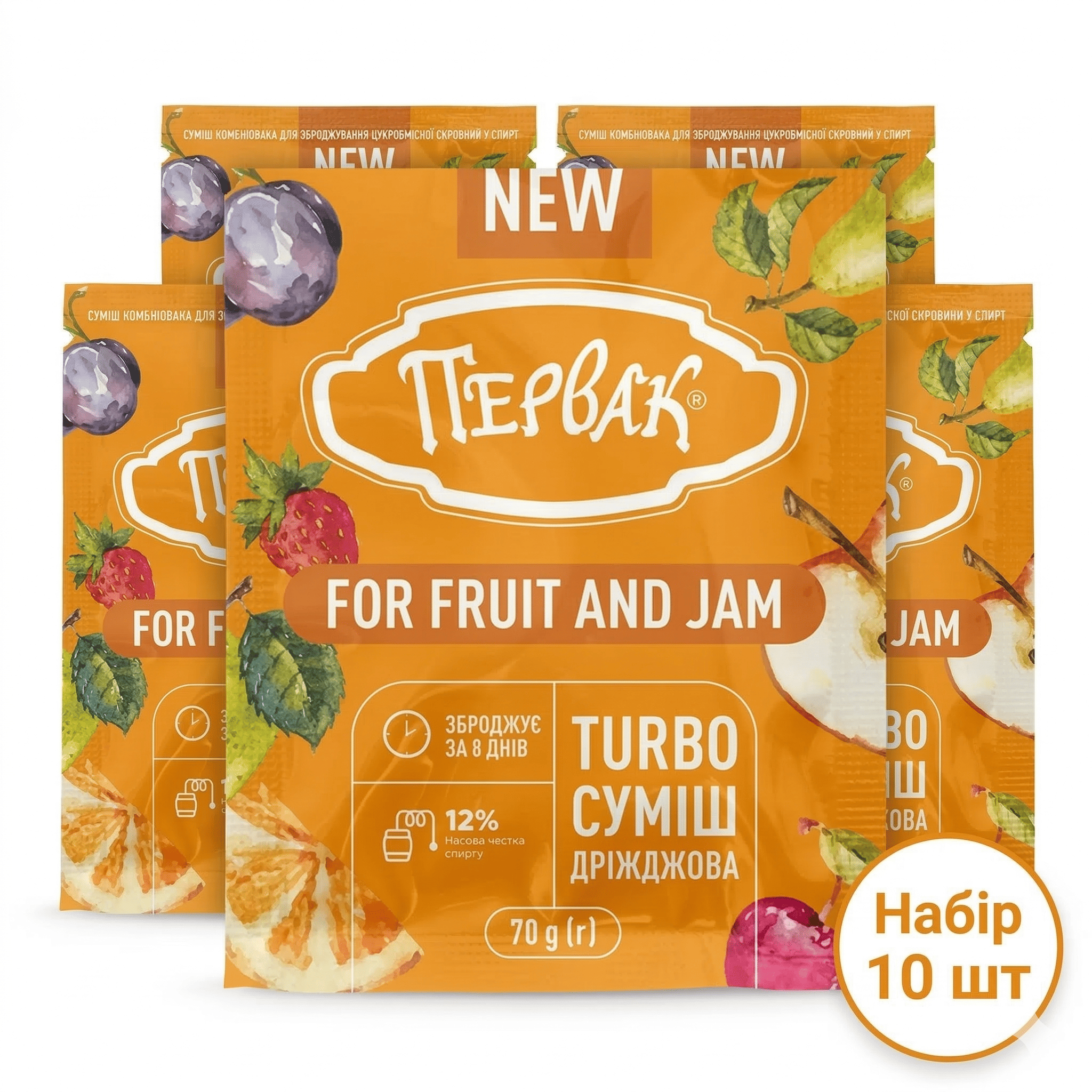 Найвигідніший набір — 10 пачок турбодріжджів Первак для фруктових браг по 70 г. Для тих, хто серйозно займається виготовленням фруктових дистилятів. Зберігає натуральний аромат сировини, бродить м'яко і без сторонніх запахів. Без ГМО.